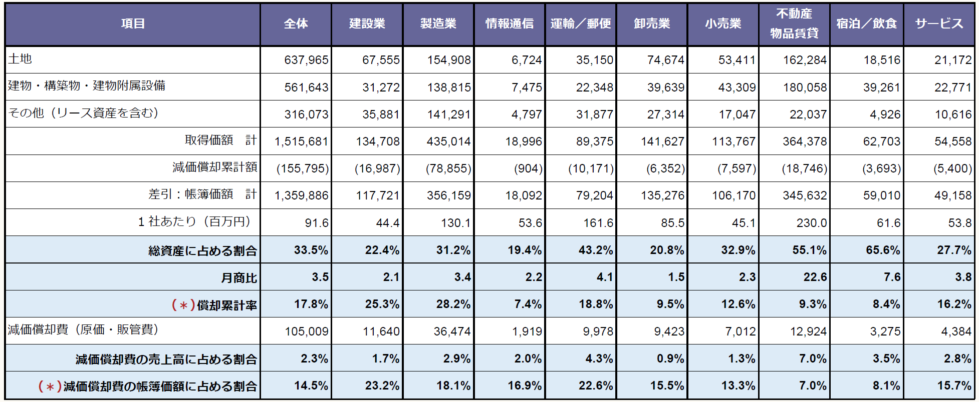 (*)印の項目は土地の帳簿価額を除いて計算している。