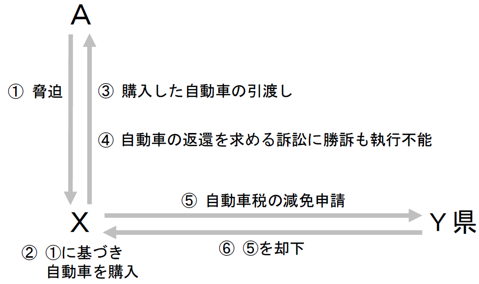 Xは、右翼団体幹部を名乗るAから脅迫を受け、自動車を購入して、購入した自動車をAに引き渡した。その後、Xは、Aに対して自動車の返還を求める訴訟を提起して勝訴したが、これに基づく動産執行は不能により終了してしまった。他方、Xには、自動車税を賦課される地位が残ったままとなった。