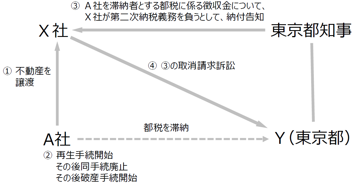 東京都知事は、A社がX社に不動産を著しく低い額の対価で譲渡したために、A社に対して滞納処分をしても、A社を滞納者とする都税に係る徴収金に不足することとなったと判断して、X社に対し、地方税法11条の8に基づき、第二次納税義務の納付告知をした(本件納付告知)。X社がその取消しを求めてY(東京都)を提訴したのが本件である。