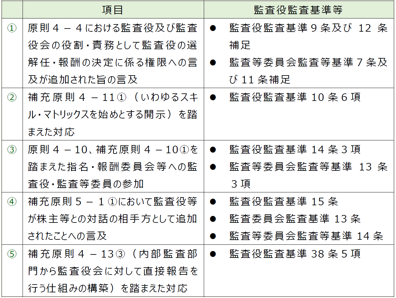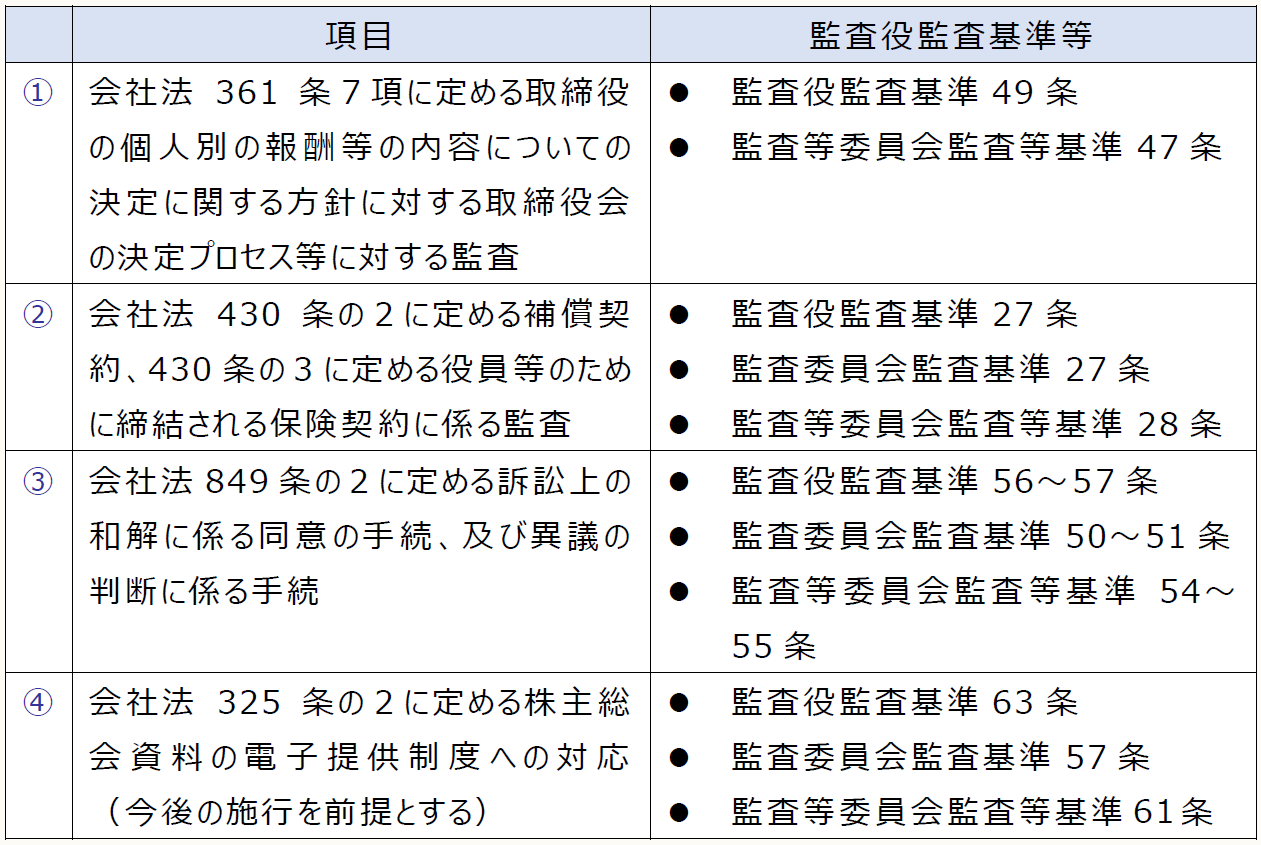 2021年10月4日、日本監査役協会は、次のものの改定に関する公開草案を公表し、意見募集を行っている。