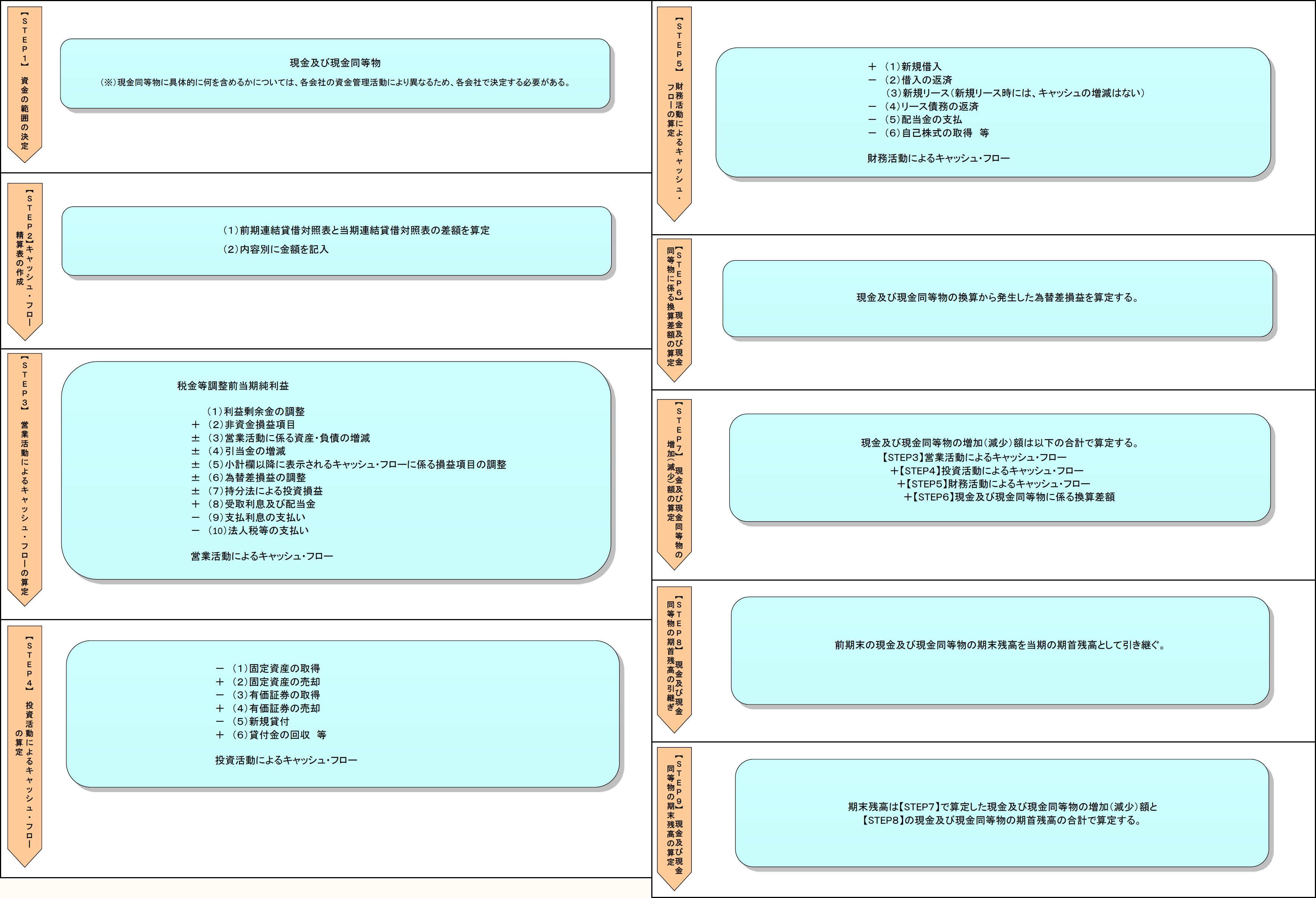 そして、連結キャッシュ・フロー計算書の作成は、以下の9つのステップに分けることができる。