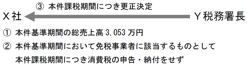 X社は、ある課税期間(本件課税期間)において、4,225万円を売り上げた。その2年前の年度(本件基準期間)におけるX社の総売上高は3,053万円だったが、本件基準期間において免税事業者であったことを踏まえ、課税売上高は、当該総売上高の103分の100(当時の消費税率は3パーセント)である2,964万円と考えるべきであるとして、本件課税期間について、消費税の申告と納付をしなかった。