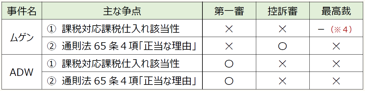 上記のとおり、両事件の主な争点は、①課税対応課税仕入れ該当性(本件更正処分の適法性)、及び②通則法65条4項にいう「正当な理由」の有無の2つであるが、両事件の第一審から最高裁までの各裁判所のそれぞれの判断を概括すると以下の【表1】のとおり(納税者側から見て、〇は処分取消し(納税者側勝訴)、✕は処分適法(国側勝訴))となる。ムゲン事件では、控訴審判決の結果を受けて、国側(税務当局)が、過少申告加算税賦課決定処分の取消しを不服として上告受理申立てを行い、また、ADW事件では、納税者側が、賦課決定処分だけでなく、課税仕入れに係る消費税の更正処分の取消しを求めて上告受理申立てを行った。