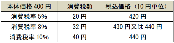 例えば、10円単位で価格を設定している事業者で本体価格を400円とした場合には、税率によって以下のようになる。