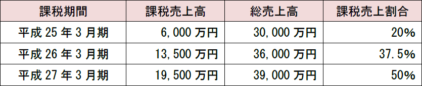 平成25年3月期以降3課税期間における課税売上高(自由診療)及び総売上高(自由診療+保険診療)の推移は、以下の表のとおりである。