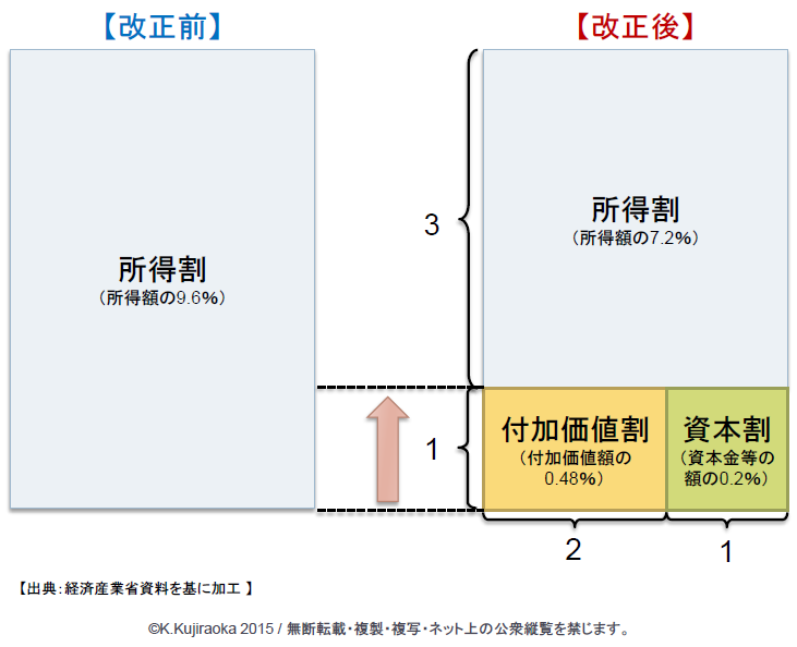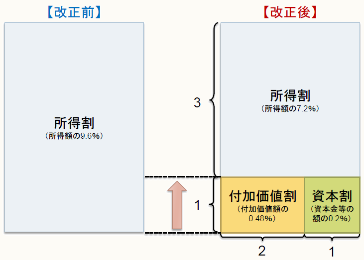 外形標準課税の導入は、事業税の税収配分の見直しであり、改正の前後で税収が変化しないように税率が設定されている。すなわち、改正前の事業税の税収のうち4分の1を外形標準課税によることとし、さらにその3分の2を付加価値割から、残り3分の1を資本割から得ることとした(下図参照)。