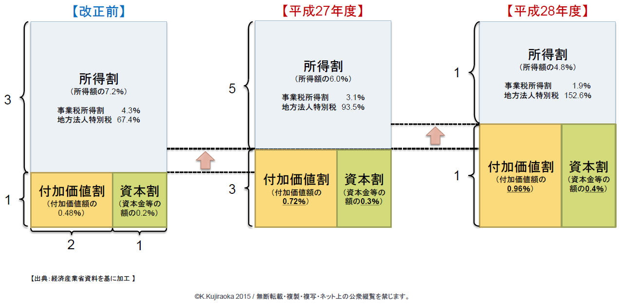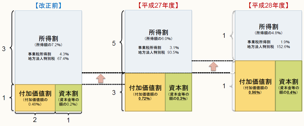 平成27年度の税制改正では、応益課税としての性質を一層強くさせるため、段階的に外形標準課税の税率を改正前の2倍に引き上げることとした。従来、事業税の税収の4分の1を外形標準課税から得ることとしていたところ、本改正により、税収の2分の1を外形標準課税から得ることとなる(下図参照)。