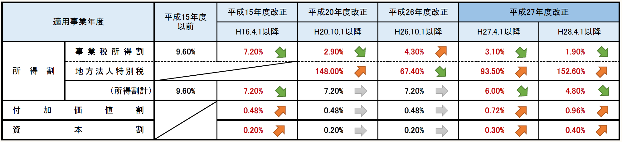 以上の税制改正を踏まえた事業税の税率の推移をまとめると、下表の通りとなる。