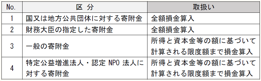 No. 区 分 取扱い 1 国又は地方公共団体に対する寄附金 全額損金算入 2 財務大臣の指定した寄附金 全額損金算入 3 一般の寄附金 所得と資本金等の額に基づいて計算される限度額まで損金算入 4 特定公益増進法人・認定NPO法人に対する寄附金 所得と資本金等の額に基づいて計算される限度額まで損金算入