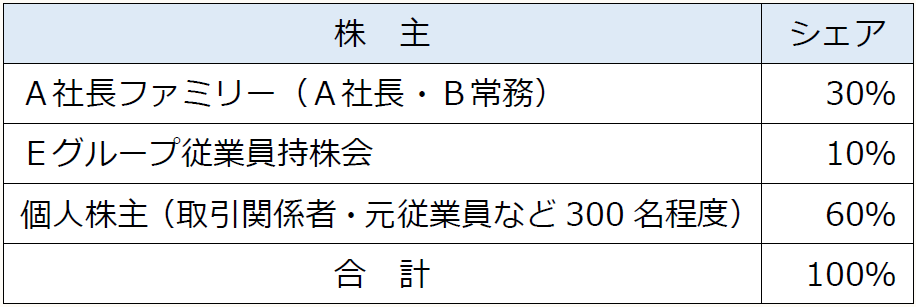先代経営者が従業員にも自社株式の保有を推奨していたため、当社には取引関係者や元従業員を中心に300名を超える株主が存在し、A社長一族の株式保有割合が非常に低い水準となっています。