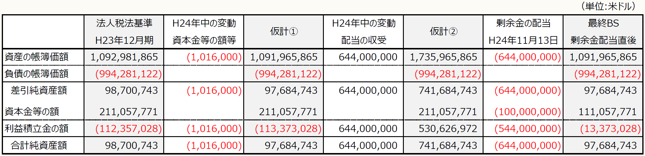 本件において、プロラタ計算の算式分母である簿価純資産価額を法令に当てはめて計算すると、剰余金の払戻しを行った平成24年11月13日(米ドル送金日)から遡ること約11ヶ月前(※12)の平成23年12月31日(KPC社の前期期末に相当)の金額ということになる。上記〔表1〕が示すとおり、KPC社の平成23年12月31日時点での簿価純資産価額は、98,700,743米ドル であるのに対し、その内訳の資本金等の額は211,057,771米ドル、利益積立金の額はマイナスの112,357,028米ドルであった。この状況ではKPC社の配当原資としては不十分だったため、KPC社は、KC社からの資金を受け、同額をXに還流させたのは上述したとおりである。