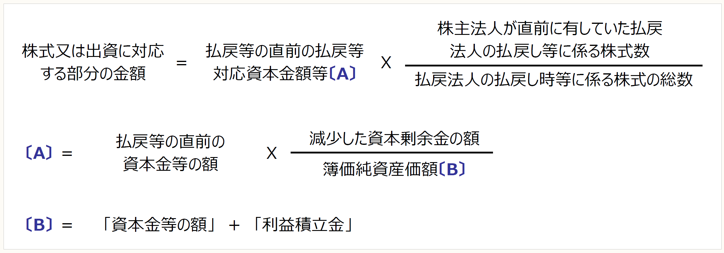 法人税法施行令23条1項4号は、資本の払戻しに係るみなし配当の金額の計算上、法人(株主)が交付を受けた金銭その他の資産から控除される株式又は出資に対応する部分の金額を求める算式について、以下のように規定している。