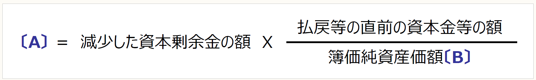 となり、分数式で求められるのは、簿価純資産価額(※9)に占める資本金等の額の割合となるので、この計算式の意味するところは、減少した資本剰余金の額のうち、全体の簿価純資産価額に対する資本金等の額の占める割合に相当する金額を計算することにある。この計算がプロラタ(按分)計算と呼ばれるのはその所以である。ただし、このプロラタ計算の分数式の分母〔B〕の金額は、平成29年度税制改正前の法人税法施行令23条1項3号によれば、払戻法人の前期期末時の簿価純資産価額を出発点とし、当該前期期末時から当該払出し等の直前の時までの「資本金等の額等」(※10)の増減を調整した金額とされていた。ここでいう「資本金等の額等」とは、前期期末時から資本の払出し(法令23①三イからの読み替え)の直前の時までの資本金等の額の増減と、同一期間の利益積立金の額の増減から構成されると定義されている(連結個別資本金等の額及び連結個別利益積立金も同様の取扱い)。