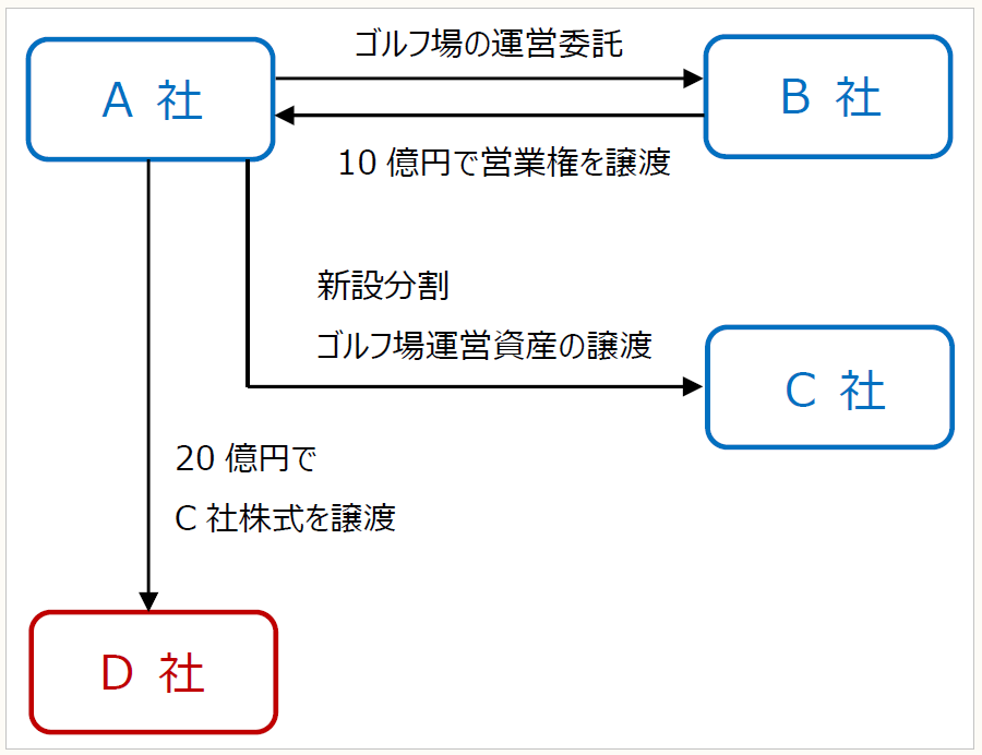 しかし、経営状況が悪化する中で、バランスシートの全面的な見直しを求められたことから、わが社の象徴的な存在であったこのゴルフ場も手放すこととなりました。その方法としては、わが社が新設分割の方法により子会社Cを設立し、当該C社にゴルフ場の運営に必要な全財産を譲渡した上で、東海地方で多数のゴルフ場を経営するD株式会社にC社の株式を時価20億円で譲渡するという手法を用いています。