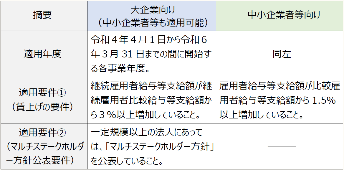 これに対して中小企業者等向けの制度では、継続雇用者ではなく「雇用者給与等支給額」の増加が適用要件とされているが、これは令和3年度の所得拡大促進税制の取扱いから変更されていない。