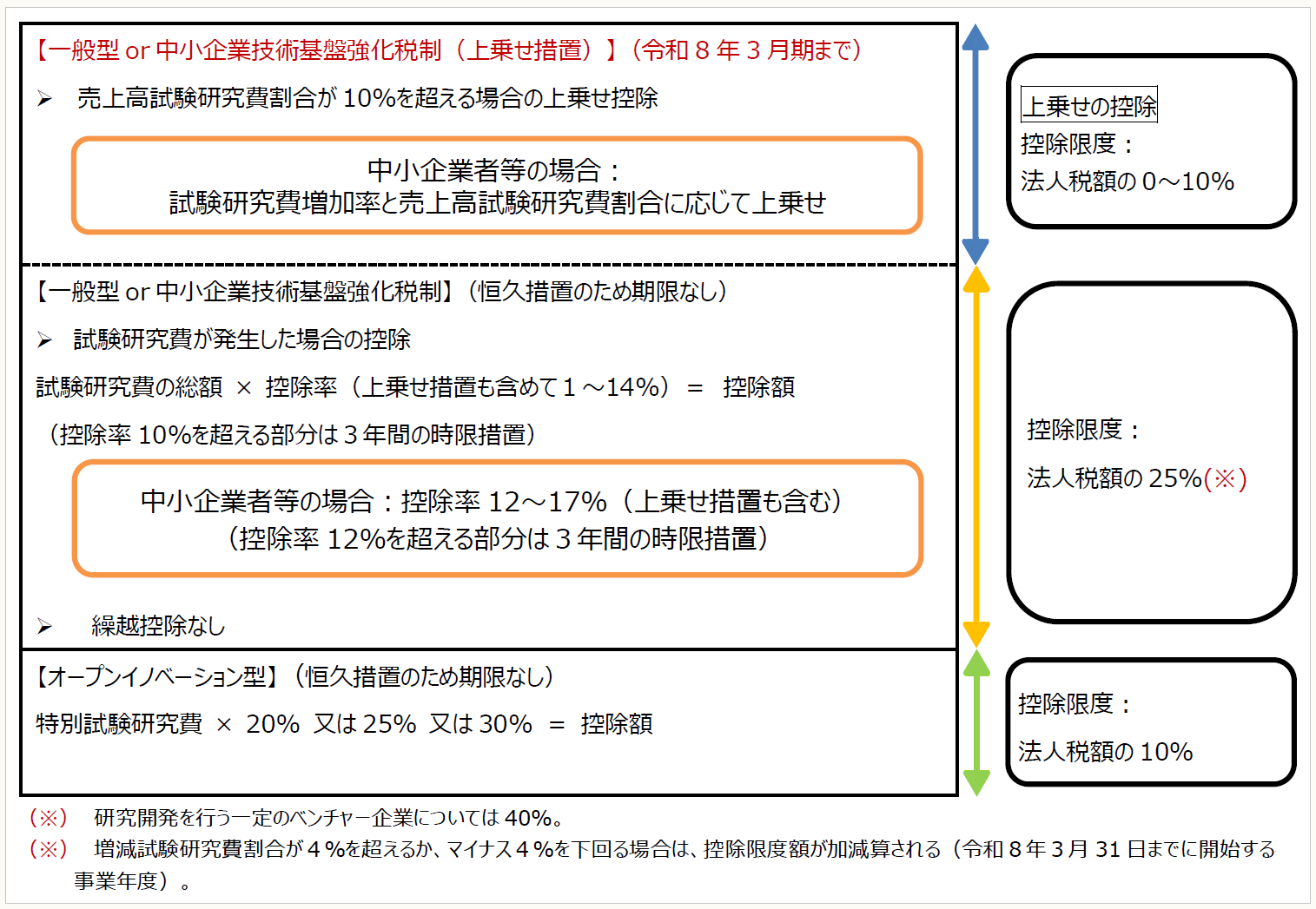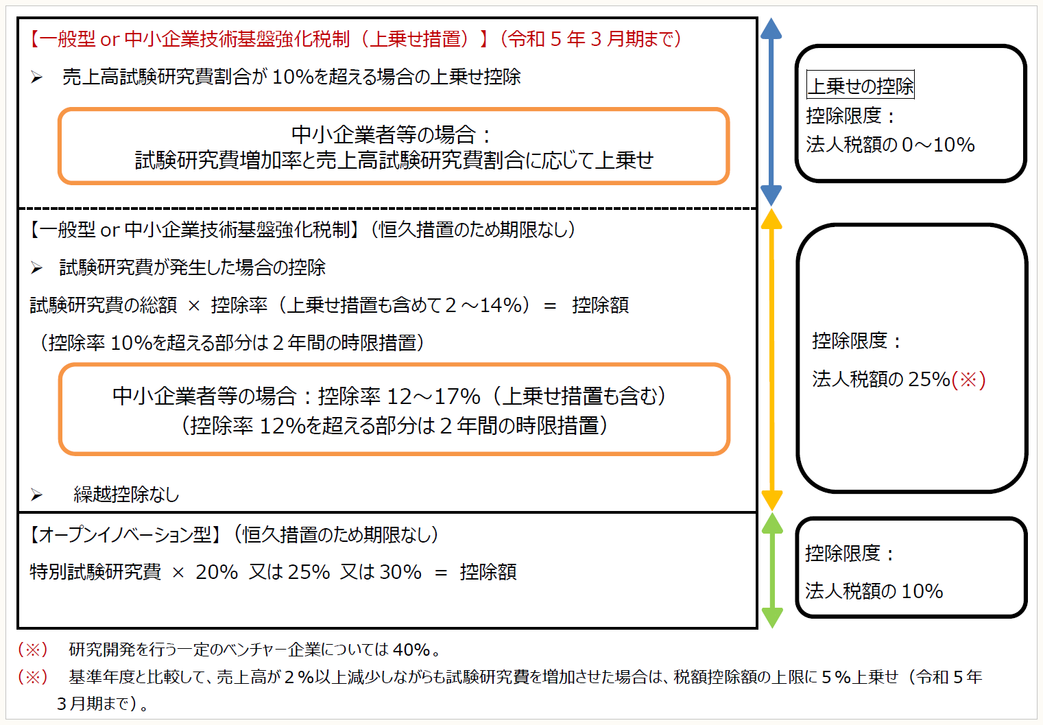 令和5年3月期までは、基本の税額控除である「一般型(中小企業者等においては中小企業技術基盤強化税制)」とその上乗せ措置、及び「オープンイノベーション型」が設けられていた。