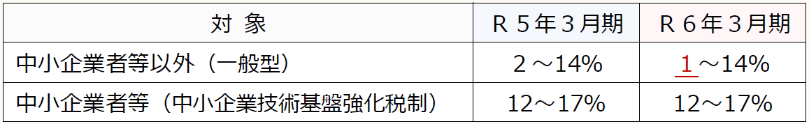 税額控除率の下限が2%から1%に引き下げられたが、中小企業者等においては変化はない。