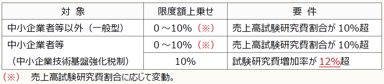 また、中小企業者等においては、試験研究費増加率が9.4%を超える場合は、控除限度額に法人税額の10%を上乗せする措置が設けられていた。これが、試験研究費増加率が12%を超える場合に適用されることと改正された。