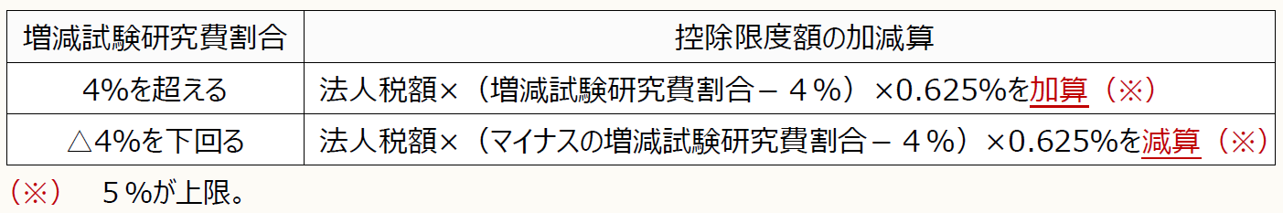 「一般型」の控除限度額は法人税額の25%であるが、令和5年4月1日から令和8年3月31日までの間に開始する事業年度においては、増減試験研究費割合が4%を超えるか、マイナス4%を下回る場合は、控除限度額が加減算される措置が導入された。