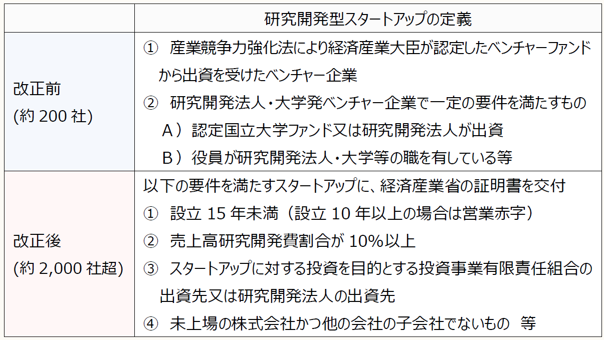 「オープンイノベーション型」の対象となる研究開発型スタートアップの範囲が下記の通り拡大された。