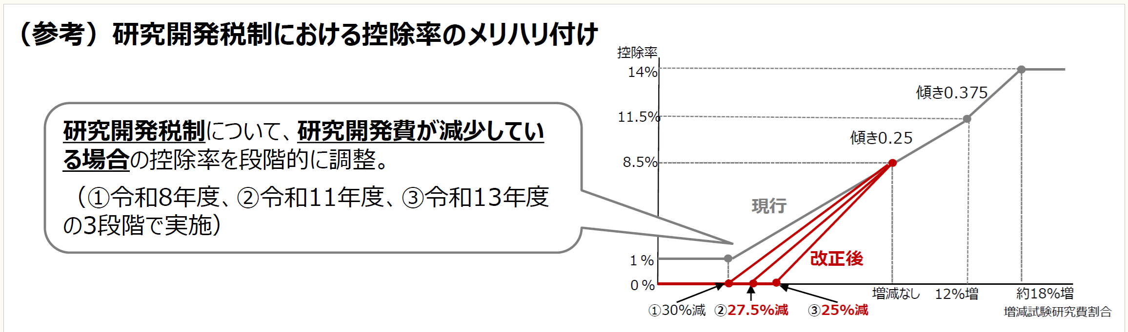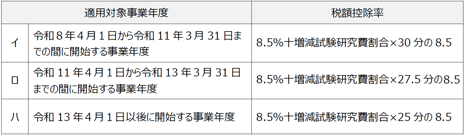 一般試験研究費の税額控除制度について、令和8年4月1日以後に開始する事業年度で増減試験研究費割合が0に満たない事業年度につき、税額控除率を次のとおり見直すとともに、税額控除率の下限(改正前:1%)を撤廃する(新措法42の4①⑧)。