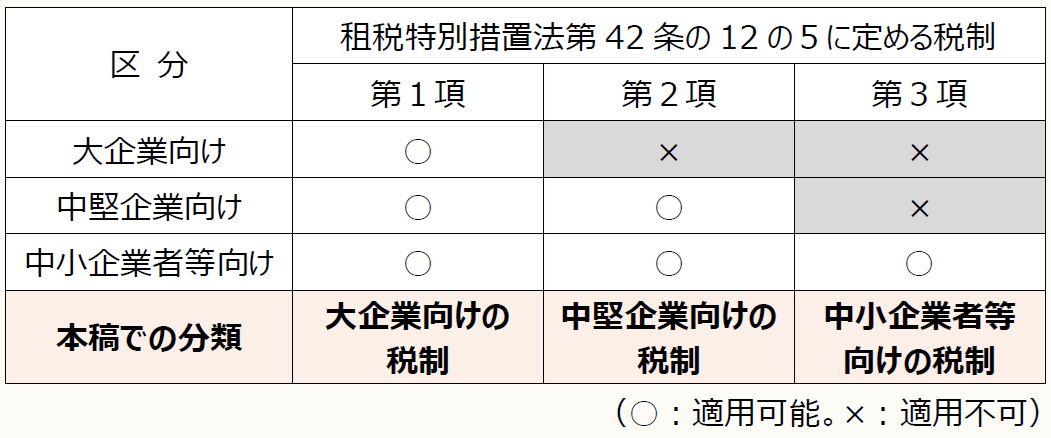 以上の整理を踏まえ、本稿では便宜的に、第1項の制度を「大企業向け」、第2項の制度を「中堅企業向け」、第3項の制度を「中小企業者等向け」と分類して、これ以降の説明を進めていくこととする(下表参照)。
