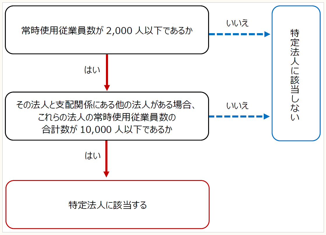 特定法人に該当するかどうかは、原則として、適用事業年度末における当該法人の常時使用従業員数が2,000人以下であるかどうかで判定することとなるが、当該法人と支配関係にある法人がある場合には、その支配関係にある他の法人の常時使用従業員数との合計数による追加判定が必要となり、その合計数が10,000人を超えると特定法人に該当しないこととされる(措法42の12の5⑤十)。なお、支配関係のある法人に海外子法人(外国法人)がある場合も、当該海外子法人の常時使用従業員数も含めたうえで常時使用従業員数の合計数を算出することとなる。