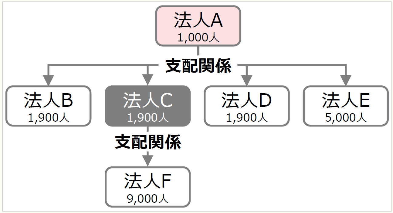 次に、支配関係のある他の法人の常時使用従業員数を合算した数が10,000人以下であるかどうかの判定を行う(最終判定)。上図の法人グループでは、以下の2つの「縦の支配関係」を観念することができる。