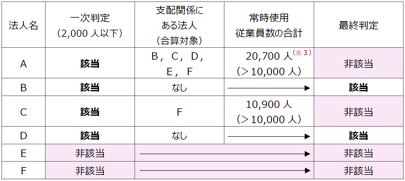 最初に、それぞれの法人の常時使用従業者数が2,000人以下であるかどうかを判定する(一次判定)。この結果、法人E(常時使用従業員数5,000人)及び法人F(常時使用従業員数9,000人)はこの時点で特定法人に該当しないこととなり、その他の法人(A、B、C、D)は、それぞれの常時使用従業員数は2,000人以下であるから、いったんは特定法人の定義を満たしうる状況である。