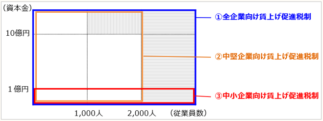本税制は、国内雇用者に対する給与等支給額を増加させた場合に、その増加額に基づき算定された一定額を法人税額から控除することができる制度であり、租税特別措置法第42条の12の5においては「給与等の支給額が増加した場合の法人税額の特別控除」との見出しが付されているところ、実際には、適用法人の規模に応じて以下の3種類の制度が用意されている。