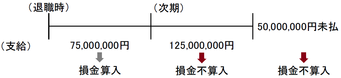 次期に支払った125,000,000円は退職給与とされていないし、法人税法第34条第1項第1号から第3号(定期同額給与、事前確定届出給与、利益連動給与)に該当しないから損金不算入となるというのである。未払分も同じである。