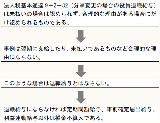 したがって、課税庁及び国税不服審判所の裁決(平成24年3月27日)では、次期支払い及び未払いは法人税基本通達9-2-32を適用できないとしており、退職給与として取り扱われないとしただけで、損金不算入の決め手となったのは、法人税法第34条第1項である。