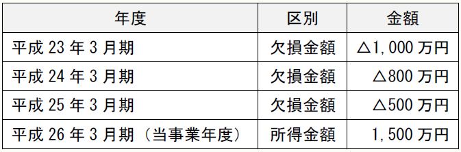 当社は資本金額1,000万円の食料品製造業を営む内国法人(3月決算)であり、各事業年度の所得と欠損の金額は次のとおりです。また、事業年度の期間は1年で、欠損金が生じた事業年度はいずれも青色申告書を提出し、その後の事業年度も継続して確定申告書を提出しています。