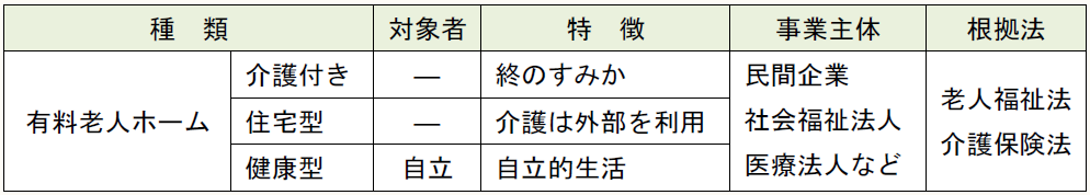 種 類 対象者 特 徴 事業主体 根拠法 有料老人ホーム 介護付き ― 終のすみか 民間企業 社会福祉法人 医療法人など 老人福祉法 介護保険法 住宅型 ― 介護は外部を利用 健康型 自立 自立的生活
