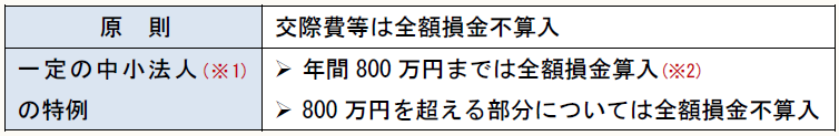 中小法人では、平成26年4月1日から平成28年3月31日までの間に開始する各事業年度においては、「中小法人の特例(年間800万円まで全額損金算入)」と「接待飲食費の50%損金算入」を選択適用できる。