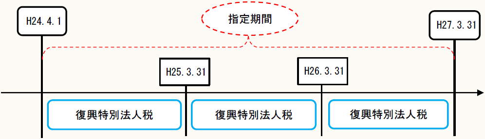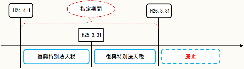 しかし、平成26年度税制改正により、1年前倒しで廃止されることになった。つまり、「平成24年4月1日から平成26年3月31日までの期間(指定期間)内に、最初に開始する事業年度開始の日から同日以後2年を経過する日までの期間内の日の属する事業年度」について、復興特別法人税が課されることとされた。