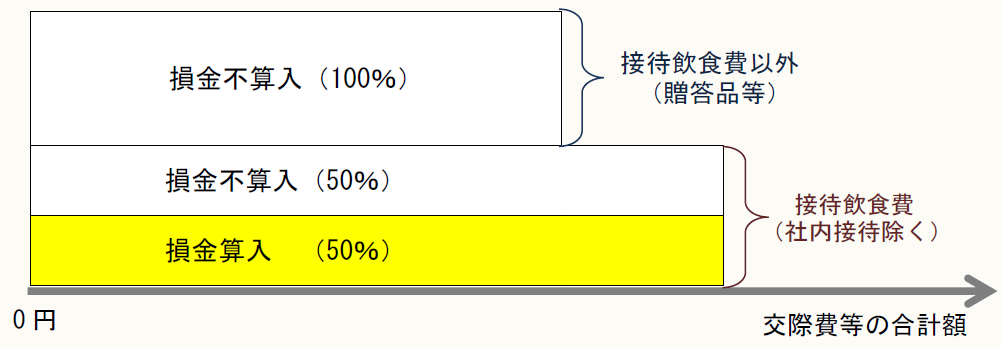 ただし、税務上の交際費等の中でもあくまで「接待飲食のために」支出したものに限定されており、すべての交際費等の50%が損金算入されるわけではない。法人内部の役員や従業員を接待した場合の飲食代(いわゆる社内接待費)は、「接待飲食費」には含まれないとされているので、50%損金算入の対象にはならず全額が損金不算入となる。