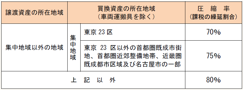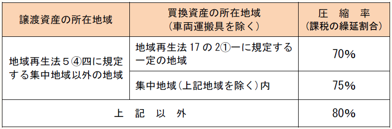 (2) 譲渡資産の所在地域と買換資産の所在地域に応じて圧縮率(課税の繰延割合)を下表のとおり引下げ