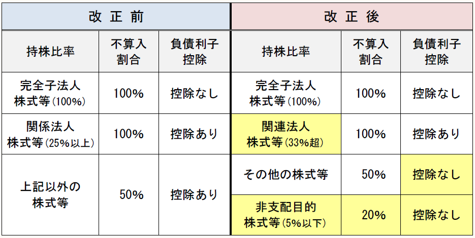 改正前は、支配目的以外で保有する株式、すなわち、完全子法人株式等及び関係法人株式等のいずれにも該当しない株式等については、配当金の50%相当額が課税の対象とされた。