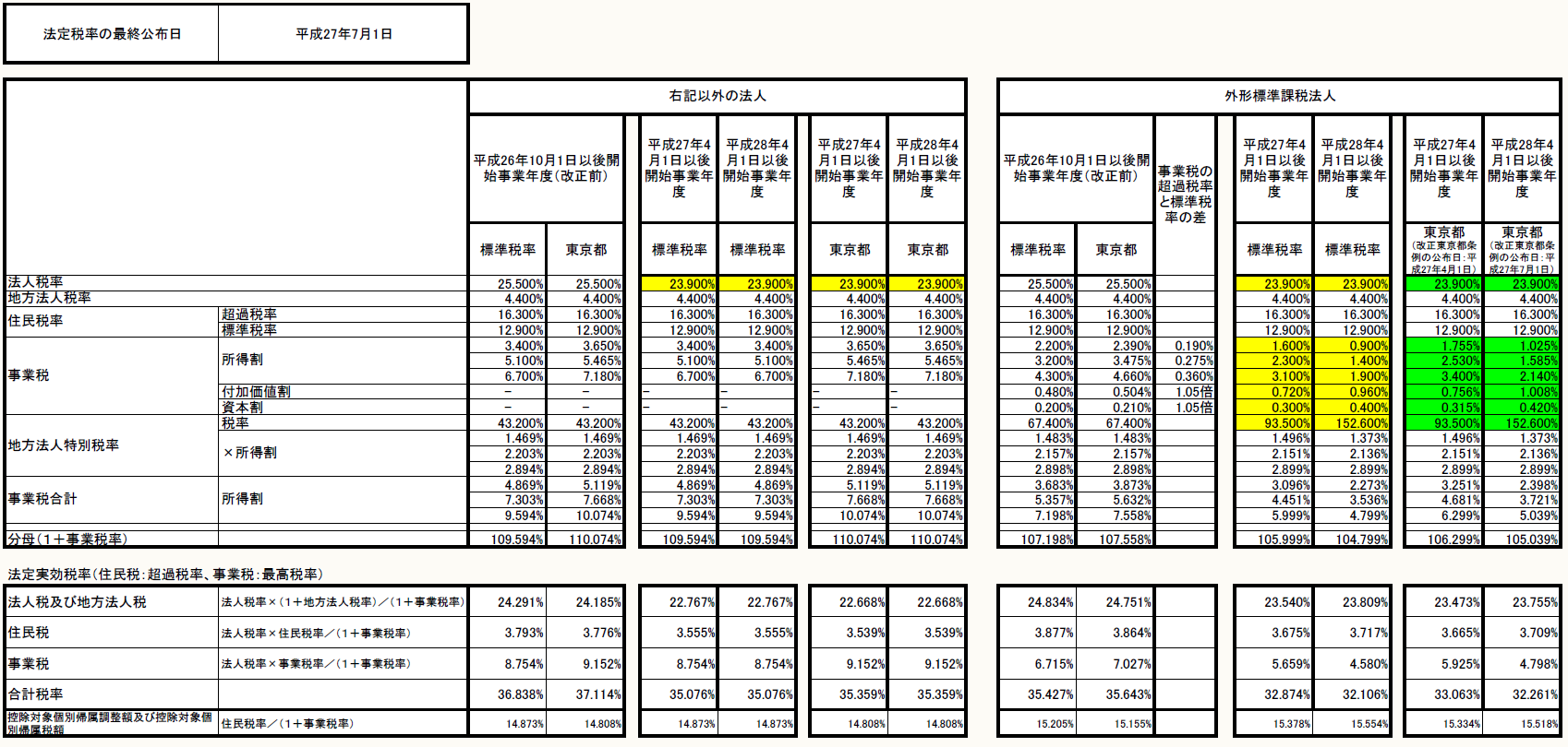 (追記:2015/7/1) 平成27年7月1日付けで東京都主税局より「平成27年度税制改正に伴う外形標準課税法人に係る法人事業税の税率の改正について(平成28年4月1日以後に開始する事業年度)」が公表された。本稿掲載時、上記表内数値については改正案による数値を使用していたが、今回そのままの数値で確定したため、表内の数値に変更は生じていない。