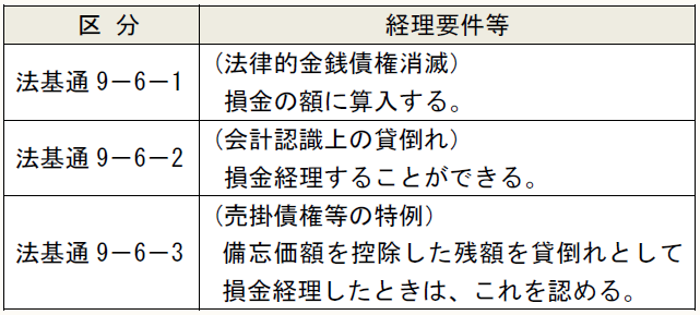 区 分	経理要件等 法基通9-6-1	(法律的金銭債権消滅) 損金の額に算入する。 法基通9-6-2	(会計認識上の貸倒れ) 損金経理することができる。 法基通9-6-3	(売掛債権等の特例) 備忘価額を控除した残額を貸倒れとして損金経理したときは、これを認める。