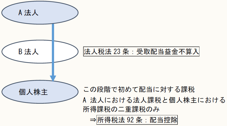 ところで、例えば、A法人の株主がB法人であるケースにおいては、A法人からB法人が受けた配当金がB法人における法人所得に算入され、B法人において法人税の課税を受けることとなり、かかるB法人の法人税の計算後の利益から個人株主が配当を受けた場合に、当該個人株主の段階で配当所得に対する所得税課税がなされると、二重課税どころか三重課税となってしまう。