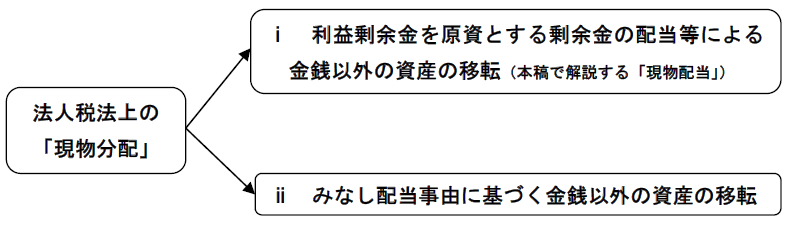 法人税法に規定する現物分配とは、次のⅰ又はⅱをいい(法法2十二の六括弧書)、本稿においては、ⅰに該当する現物配当が行われたものとして会計上の取扱いを述べることとする。