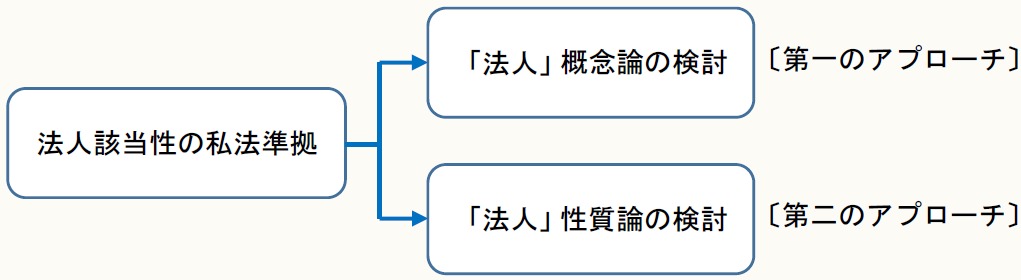 すなわち、第一のアプローチとしては、概念論の見地から「法人」という租税法上の用語の意義の解明に当たり、私法上の理解を参考にする方法が考えられる。第二のアプローチとしては、性質論の見地から租税法上の「法人」と私法上の「法人」を比較して考える構成である。この2つのアプローチは似ているものの、実は理論的には非なるものである。
