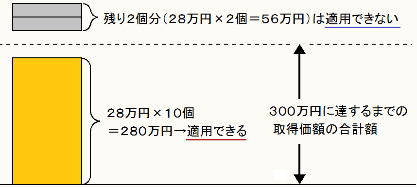 この制度には適用資産の合計額が年300万円以下とする上限額が設けられており、300万円を超えるときはその総額が300万円に達するまでの取得価額の合計額となる。