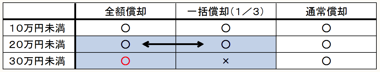 (※) 一括償却は、取得価額が20万円未満の資産を3年で1/3ずつ損金とすることができる規定である(法令133の2)。