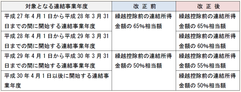 連結欠損金の繰越控除制度における控除限度額の段階的引下げについて、次のとおり見直しを行う(法法81の9①、平成27年所法等改正法附則30②、平成28年所法等改正法18)。