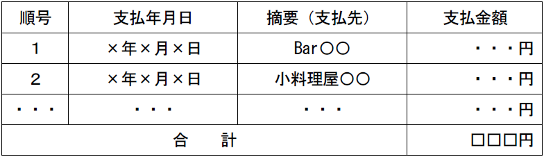 順号	支払年月日	摘要(支払先)	支払金額 1	×年×月×日	Bar〇〇	・・・円 2	×年×月×日	小料理屋〇〇	・・・円 ・・・	・・・	・・・	・・・円 合  計	□□□円