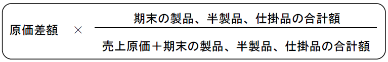 具体的には、その試験研究費を他の原価差額に加算し、その加算後の原価差額がプラスのときは、期末棚卸資産に対応する部分の金額をその期末棚卸資産に加算することとなる(法基通5-3-1)。また、その原価差額を一括して次に掲げる算式により期末棚卸資産に配賦する方法も認められている(法基通5-3-5)。