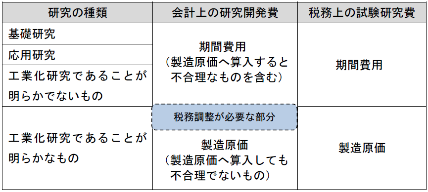 つまり、工業化研究に該当することが明らかな試験研究費については、会計で費用処理され、税務上は製造原価に算入しなければならず、この部分で税務調整が必要となる。会計上一時の費用として処理された製造原価となる試験研究費は原価差額として税務調整することとなる。